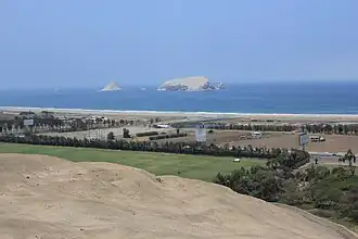 The Peñón Pachacámac island, also called San Francisco islet, is shaped like a sugarloaf and is the second largest with an area of 7.05 hectares.[4] Between the San Francisco and Pachacámac islands is the El Sauce islet, a small cliff located 265 meters from the main island. Southeast of San Francisco is the Corcovado reef, where the group ends. It is a stand of rocks on the surface of the water, which extends approximately 1 km long and in which the sea bursts.[5] Viewed from a distance, the entire island complex resembles the silhouette of a gigantic whale emerging from the sea.