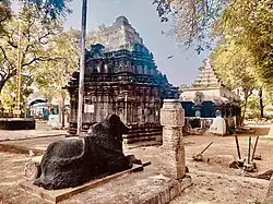 Based on the inscriptional evidence and the architectural style, the Pachala Someswara temple is dated to the 11th-12th century CE. It was probably built during the rule of Kanduru Chodas and Prataparudra I of Kakatiya Empire who ruled over the Panagal region.[2] The ground plan of the temple is distinctly different from other shrines in Telangana. It has four shrines in total and three of the shrines are situated on the western side, while one is on the eastern side with a common and large rectangular mandapam. The main shrine is dedicated to Shiva in the form of a Linga made of green onyx stone (Pacha in Telugu) which gives the temple its name Pachala Someswara.[5] The temple has a pillared hall, at the end of which is a Nandi statue facing the presiding deity Pachala Someswara (Siva linga).