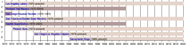 The division was created at the start of the 1970β71 season, when the league expanded from 14 to 17 teams with the addition of the Buffalo Braves, the Cleveland Cavaliers and the Portland Trail Blazers. The league realigned itself into two conferences: the Western Conference and the Eastern Conference, with two divisions each in each conference. The Pacific Division began with five inaugural members: the Lakers, the Blazers, the San Diego Rockets, the San Francisco Warriors and the Seattle SuperSonics.[1] The Lakers, the Rockets, the Warriors and the SuperSonics all joined from the Western Division.