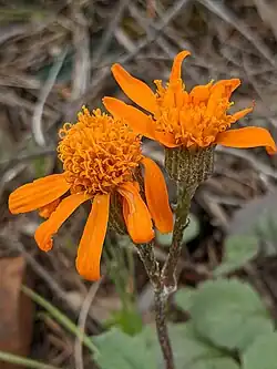 The inflorescence contains one or more flower heads, each lined with woolly, green- or red-tipped phyllaries. The head bears up to 13 narrow ray florets which are a distinctive orange or red-orange in color. They may approach 2 centimeters long.