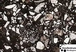 Thin section photomicrograph of peloid packstone with fragmented bioclasts.