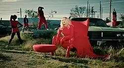 It begins with Minogue wearing a red dress and lying on a bed, with a static television in the background.[123] It then shows Minogue in a junkyard wearing a custom Mugler catsuit with a cape, alongside a group of backup dancers dressed in red.[123][124] Another shot shows Minogue in a roadside diner while the dancers perform the song in another red outfit. Minogue then dances with the backup dancers outside the Pink Motel.[123] Extra scenes from the original shoot were released on the music video's extended edit, along with a visualiser featuring Absolute's remix.[119][125][126] The music video premiered on Minogue's YouTube channel on 18 May 2023.[127] It received positive feedback from publications; Phoebe Luckhurst of The Australian described Minogue's "vampiric femme fatale" look and the set as a "candy-coloured Americana dreamland".[121] Mollie Davis of Good Housekeeping praised Minogue's performance, calling it "incredible". She elaborated, "In classic Kylie style, the music video for "Padam Padam" is "racy, electric, and features plenty of dancing."[128]