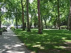 St Mary on Paddington Green Church is part of the Parish of Little Venice and is the third church on this site. The church was built in 1791 by John Plaw.[4] Its graveyard – known as St Mary's Gardens (or St Mary's Churchyard) – contains monuments to notable local residents, including actress Sarah Siddons (also buried there), sculptor Joseph Nollekens and lexicographer Peter Mark Roget.[5] The southern part of the graveyard was removed to make way for the flyover. Exhumed remains were re-interred in Mill Hill Cemetery.[6]
