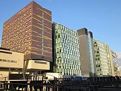 The original plan for the eastern end envisaged a commercial development focused around the Grand Union Basin and included the Winding building and the Grand Union building.[27] The Richard Rogers Partnership originally designed the latter as three towers of 24, 32 and 40 floors rising to 164m, but the planners imposed a height limit of 100 metres (330 ft).[28] The revised scheme comprised six linked blocks of 30 storeys totalling 860,000 sq ft (80,000 m2) of mixed-use space,[28] but the project was discarded when it looked like the site would be needed by the Health Campus (see below).[29]