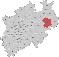Paderborn is located in eastern North Rhine-Westphalia. As of the 2021 federal election, it is coterminous with the Paderborn district.[1]