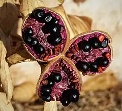 The flowers are set individually at the top of the stems, are mostly subtended by one or two bracts looking like a leaf segment, and may be up to 15–16 cm in diameter. It has three, sometimes four, sepals, green with a purple margin, of approximately 3 cm long and 2½ cm wide, with rounded tips. There are five or six magenta or pinkish magenta petals, each 5–6 cm long and 3–4 cm wide. Numerous stamens consist of cream-colored, yellowish or purple filaments topped with yellow anthers. There are mostly two or three (occasionally one or four, rarely five) carpels covered in 2 mm long rust-colored hairs, with at their tips very short red stigmas of 2½ mm wide, their base encircled by a 2 mm high disk. The fruit consists of two to three (seldom one or four) follicles, each of which is up to 2½-4 cm high, and is covered in dense felty hairs which persist when fully grown.[4][5] In its home range, this species has flowers from late March to May,[6] but in The Netherlands flowering occurs in June and early July.[7] The seeds are about 7–8 mm in size, reddish at first but blackish when ripe.[8]