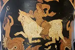 According to Strabo, the city was founded as Poseidonia (named after the Greek deity of the sea) by Greek Achaeans from Sybaris. The colonists had built fortifications close to the sea, but then decided to found the city farther inland at a higher elevation.[17] Solinus wrote that it was established by Dorians.[18] The fortifications might have been built to the south of Poseidonia on the promontory where Agropoli is now. According to the historical tradition the sanctuary to Poseidon was located there, after which the city would have been named. The date of Poseidonia's founding is not given by ancient sources, but the archaeological evidence gives a date of approximately 600 BCE.[19]