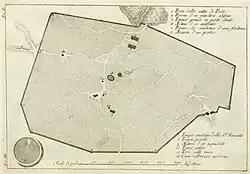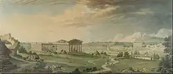 In 1740 a proposal was made, but not executed, to remove columns for the new Palace of Capodimonte in Naples. Initially, eighteenth-century savants doubted that the structures had been temples, and it was suggested variously, that they included a gymnasium, a public basilica or hall, or a "portico".[29] There also was controversy and misunderstanding of their cultural background. Alessio Simmaco Mazzocchi, a clergyman and antiquarian, "the founder of the modern study of Magna Graecia" (the ancient Greeks in Italy),[31] thought they were Etruscan, in line with his theories that Greek colonists merely had joined existing cultures in Italy, founded by peoples from farther east.[32] He derived the etymology of "Poseidonia" from an invented Phoenician sea deity.[33]