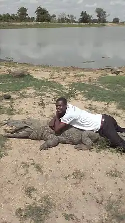 The locally-told origin of the pond was that a crocodile brought a dying man to the pond to drink, who, after surviving, declared the pond to be sacred and that no harm should come to the crocodiles. This legend of the crocodiles is claimed to date back to about 600 years. The crocodiles are considered to be totems for these local people.[1][2] Another story states that a man was trapped against the water's edge by a lion, when he bargained with a crocodile that none of his children would harm his kind if he would kill the lion.[3] It is believed that the souls of the people of Paga reside in these crocodiles.[2] It is an offence to kill crocodiles in Paga, or eat crocodile meat.[4]