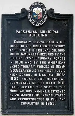 The building was first constructed during the middle of the 19th century and was used to house the Tribunal del Gremios de Naturales (Tribunal Court for the Local Government for Natives), a tribunal court of one of Pagsanjan's local government unit formed by the Spanish authorities during the 1600s.[1] It served as quarters of the Filipino revolutionary forces under the leadership of Gen. Taino during the Philippine Revolution of 1898 and the American Expeditionary Forces during the Philippine–American War from 1899 to 1903. From 1903 to 1907, it housed the first public high school in Laguna under the American teachers known as Laguna High School before it was transferred to Santa Cruz. It also housed the first public elementary school from 1864 until 1911 pursuant to the Educational Decree of 1863 signed by Queen Regent Maria Cristina of Spain.[1] It then became the seat of the government of Pagsanjan before it was destroyed during World War II on March 20, 1945. It was rehabilitated and reconstructed from 1951 and completed in 1955.[2]