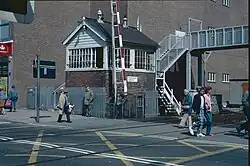 Two signal boxes were opened in 1889, the 13-lever North Signal Box beside the Torbay Road level crossing, the 17-lever South Signal Box by the Sands Road level crossing. Both were replaced in 1924 by two new boxes. The North box closed on 26 March 1988 when control of trains was transferred to the Panel Signal Box at Exeter but the South box was retained to monitor the two level crossings. In 1990 this function was transferred to a panel in the station buildings and the signal box closed.[3]