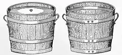 A full pail, complete with lid (left), and an empty pail, ready to be returned. These are Rochdale pails, made from wood. Manchester's pails were made from galvanised iron, with India-rubber beading around the lids to seal them.[9]