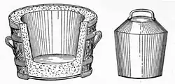Some pails were supplied with deodorants such as iron sulphate. Manchester Corporation attempted to remove the smell of putrefaction by attaching cinder-sifters to their closets so that fine ash could be poured on top of the excrement.[16] The Goux system, invented in the 1860s by Pierre Nicholas Goux, a landowner near Paris, and widely used in France, overcame some of the more common problems associated with pail closets by lining the pail with an absorbent material.[1] The Rochdale Corporation experimented with Goux's design for several months but settled instead on a system which used smaller pails. Goux's system did, however, find a home in Halifax, where it was used in more than 3,000 closets after 1870. The wooden pails used in Halifax were oval in cross-section (about 24 by 19 inches) and 16 inches deep. Each was lined at the sides and bottom with a mixture of refuse, such as straw, grass, street sweepings, wool, hair, and even seaweed. This lining, which was formed by a special mould and to which sulphate of lime was added, was designed to help remove the smell of urine, slow putrefaction and keep the excreta dry. Pails were collected between 7 am and 5:30 pm. Members of the public occasionally complained about the smell, which usually occurred when a pail was left to overflow, such as in winter 1875 when severe weather conditions prevented the horse-pulled collection wagons from reaching the closets.[17]