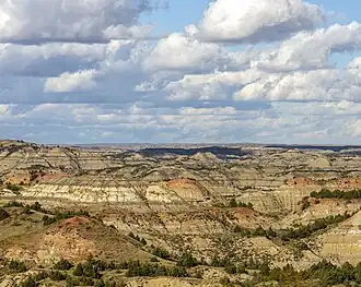 ![]() The Painted Canyon, as viewed from I-94 in Theodore Roosevelt National Park | |