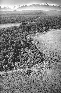 When the West Coast was settled by Europeans, pakihi seemed like ideal farmland, with no forest to clear: it merely required draining and sowing with grass seed. This was easier said than done in flat areas with high rainfall, and much pakihi was abandoned as too difficult to farm. For many years, farmers tried to turn pakihi into productive land, experimenting with sowing different pasture grasses, liming, adding large amounts of fertiliser, and even using explosives to break up the iron pan.[7][8] Different techniques were explored by the Cawthron Institute on experimental plots near Westport starting in the 1920s, when 1,100 acres were "reclaimed" and turned into dairy pasture in the 1930s, largely unsuccessfully.[9] Today pakihi can be converted into pasture by "flipping" the top two or three metres with a digger to break up any soil pan and allow free drainage, or by "humping and hollowing": both require heavy application of fertiliser such as superphosphate for years to increase soil carbon and nitrogen.[10][11] One side effect of such large scale land conversion is pest outbreaks, as the "blank slate" created allows insects to multiply rapidly, free of natural enemies. After "flipping" at Cape Foulwind, mānuka beetle larvae (Pyronota festiva), usually present at a density of 80 per m2, were recorded at over 3500 per m2.[10][12]