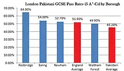 The achievement of Pakistanis in London at GCSE level is 10 percentage points higher than that of Pakistanis throughout England.[14] The highest attainment within London was found in the borough of Redbridge.