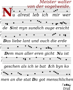 - ^ Both titles are modern conventions. Palästinalied was introduced in the debate on the interpretation of the melody discovered in 1912. R. Wustmann, "Walthers Palästinalied", Sammelbände der internationalen musikgesellschaft 13, 247–250.