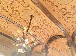 Palace Theatre's interior design is French and features garland-draped columns and pale pastel colors.[2][4] The interior lobby also features marble walls and mosaic tiles, and while a carpet at one point covered the decorative flooring, it has since been removed.[8] The building's basement originally featured a paneled men’s smoking lounge and fireplace, and the ladies upstairs lounge a marble fountain.[9] The building's upper-floors, designed for offices, feature large window openings and long and open floorprints.[8]
