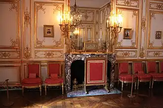 With the exception of reclaiming part of the apartment of Madame Adélaïde, Louis XVI chose to retain the décor of the petit appartement du roi as his grandfather had left it.[6] The arrière cabinet of Louis XV was rechristened cabinet des dépêches (1789 plan #8); however, Louis XVI continued to use the room as day-to-day workroom as his grandfather had (Rogister, 1993).
