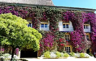 The entry door is of Mudéjar style.[7] The palace was fitted with eleven patios, nine fountains, and over 100 marble columns. Of these, one patio remains, and it is surrounded by a gallery with columns.[1] The Andalusian patio, like a similar one at Casa de Pilatos, dominates the exterior of the property. At the entrance to the palace, in the main archway, there is the shield of the Duchy of Alba in tiles, made by Triana of Seville in the 17th or 18th century. The gardens hold very important and unique species of plants (for example, one of the oldest Cycas revoluta in the world). Its fabulous bougainvillea facade is an icon of the Palace.