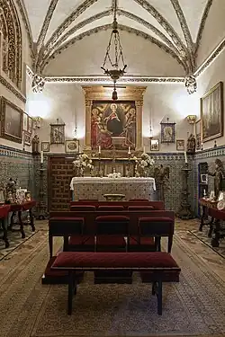 The courtyard garden, divided into four parts in keeping with its traditional Islamic style, includes tiled paths and a centralized raised fountain.[8] The palace garden's lemon trees and fountain are recurring symbols in Machado's poetry.[9] Behind the garden is a courtyard surrounded by arches with columns of white marble. The arch situated west of the courtyard in the lower galleries gives access to the building that was used as chapel. The 15th-century chapel has fared badly during restorations.[1] The altar contains several tiles with metallic reflections, typical of 16th-century Seville ceramics.