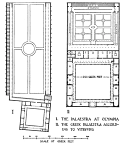 Plan of the palaestra at Olympia (left) and reconstruction of Vitruvius' description of the palaestra (right), from a 1914 translation of Vitruvius. The plan on the left incorporates guesswork, as the west side has been eroded by a river (the oblique angle is forced by the wider layout of the sanctuary). The xysta are also guesswork. On the right, the letters indicate: Exedrae (A), ephebeum (B), punching-bag room (C), conisterium (D), cold washing room (E), oil storeroom (F), cold bath room (G), furnace room (H), sauna (I), Laconicum (K), hot bath (L).