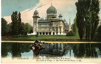 Vaissier hired the prominent local architect Édouard Dupire-Rozan (1842—1901), himself a native of Roubaix who had trained in the atelier of Charles-Auguste Questel at the Ecole des Beaux-Arts in Paris, before returning to Roubaix and making his name building a number of large villas for industrialists in the region.[7] Vaisser asked Dupire-Rozan to design his house according to the following programme: a sumptuous château, majestic and original, representing an Oriental form and style, surmounted by a grand dome adorned with stained glass. The resulting mansion was built in 1891–92 in a park covering five hectares, extending from the rue de Nouveau to the avenue Grau, and from the rue du Congo and a canal. This large verdant landscape was punctuated by ponds supplied with water by fountains and adorned with boulders, and a brook traversed by a rustic-looking bridge apparently made from largely unseen logs or branches.[8] Though initially Vaissier had hoped Dupire-Rozan might design him a house perched on the forms of four massive elephants, it became clear that this would be impractical.[7]