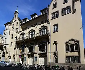 The main entrance to the Palais is on rue Sellénick, a street created in 1888 (original name: Julianstraße).[26] The entrance to the rear wing is on boulevard Clémenceau, a street created in 1881 (original name: Steinring).[27] The whole complex takes up half of the square block delimited (clockwise) by boulevard Clémenceau, rue Specklin, rue Sellénick, and rue de Phalsbourg. It does not, however, stand out in height from its immediate surroundings. The only conspicuous element is the octagonal tower at the corner of rues Sellénick and de Phalsbourg, structurally (but not stylistically) close to the tower of the Mulhouse courthouse (French: tribunal d'instance) designed by the same two architects and inaugurated in 1902.[28]