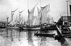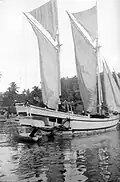In the 18th century, Bugis people sailed a type of perahu similar with patorani. The hull is from pajala type, the rig is using a canted triangular sail in a tripod mast, with weight less than 50 tons. Many of them can bee seen in Australian beach collecting teripang between 1800–1840.[6] In 1880, a boat dubbed "Bugis prahu" seems to have been the prototype of palari hull. It was a midway development to palari, with western-styled deck but with traditional (indigenous) stern (the ambeng stern). A bowsprit and jibsail has been added, but it's still using a tanja sail on a single tripod mast. There was no cabin at the stern.[7]