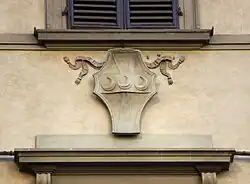 At the centre of the front is a shield with the coat of arms of the Strozzi family, without enamels (at the fascia charged with three growing faces in band), to which the building belonged, as on the other hand did all the factories on this side of the piazza.[1]