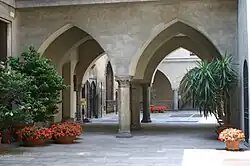 Also in Vitaliano's time, two courtyard wings were constructed behind the older building: the first, a small service court, was for horses, merchandise, and business transactions, while the second court, behind it, is larger and functioned as the formal entrance space to the house (cortile d'onore) for the family and their guests. The columns forming porticoes in the courtyards (severely damaged in 1943 and restored) are short and sturdy, carved from serizzo (a type of granite), with capitals of large, stylized leaves; they also carry pointed arches and echo the shape and proportion of the main portal. The inner courtyard is the part of the house that is best preserved; some of the original frescoes on the walls are still visible. In the courtyard itself, frescoes on the three walls above the porticoes were badly damaged. On the fourth side is a building called the palazzina (little palace), which fortunately retains most of its decoration. Six large arched windows and one small square window adorn its two-story facade, with elaborate terracotta frames characteristic of the period in Lombardy. The brick wall of the palazzina was plastered and painted with a colorful repeating pattern of a count's coronet, groups of rings (a heraldic motif), and the Borromeo motto, humilitas (humility).[10]