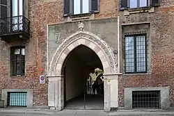 Substantial additions were made to the Casa Borromeo in Vitaliano's time, but the original late Gothic facade was retained; it has undergone several modifications through the centuries (most notably after bomb damage in World War II). The main feature of the facade is the large doorway commissioned by Vitaliano, an elegant portal in the center of the main facade, skillfully carved with a decoration of vines and oak-leaf clusters. This has a pointed arch adopted from French Gothic architecture; the Visconti dukes had intermarried with the French royal family, and French style was very popular in the duchy. The marble of the portal proclaimed the status of the Borromei: there were few quarries on the flat plain of the Po River that ran through Lombardy, and only the very wealthy could afford to import marble from the foothills of the Alps.[7] The alternating stones of the archivolt are red marble from Verona and pink marble from Candoglia, the latter from a quarry whose output was (and still is) reserved by law for the construction of the Duomo (cathedral) of Milan; only a family highly favored by the dukes would be able to secure even small blocks of that stone.[8] On the top of the door is a figure of a crowned camel in a basket, signifying the Borromei's far-reaching and exotic trade. A rectangular area surrounding the top of the portal was once painted with a scene of the Annunciation, with the archangel Gabriel on one side and the Virgin Mary on the other. Though damaged and faded over the years, it was still visible until 1943.[9]