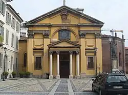 The Casa Borromeo stands across the piazza from the church of Santa Maria Podone, whose history is bound up with that of the Borromei. Founded in 871, the building was remodeled and extended after the family was given the patronage of the church in 1442. Architects of the Solari family added a large chapel for the Borromei on the right side of the church, now the Chapel of the Holy Family. In 1495/1500, sculptor Cristoforo Luvoni carved a lunette over the main door of the church depicting the Virgin and Child between father and son, Vitaliano and Filippo. A new facade built in 1626-30 by Fabio Mangone prominently featured the "Humilitas" motto with the count's coronet above the main portico. In 2012, the church was granted to the Orthodox Church of Italy.[16]