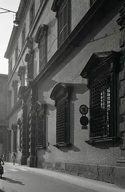 The palace was commissioned by Girolamo Caprara, and tradition holds that the primary layout, completed in 1603, is due to the architect Francesco Terribilia. Later refurbishments in 1705 were by Giuseppe Antonio Torri and his pupil Alfonso Torreggiani. The grand entry staircase to the piano nobile is attributed to Antonio Laghi. The piano nobile has frescoes by Petronio and his son, Pietro Paltronieri (also called il Mirandolese), Vittoria Maria Bigari (1720 c.), and Bernardo Minozzi. In 1805, Napoleon stayed and later acquired the palace.[1] At one time, one of the galleries had quadratura by Ercole Graziani. To the right of the palace was a small Chapel with artworks by Fortuzzi Speziali, Carlo Cignani, Giuseppe Marchesi, Vittorio Bigari, Angelo Pio and Antonio Pavona.[2]