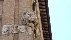 Despite its 20th century reduction, the palace has retained its late Renaissance character,[10] and together with the palazzi Torlonia, dei Penitenzieri, and Serristori, is one of the four Renaissance palaces in Borgo which survived the destruction of the spina between 1937 and 1950. The brick façade, which on the ground floor has a rusticated render, contains several shopfronts.[13] The main portal, which was moved during the reduction of the façade from 12 to 8 bays, is flanked by two Doric pillars, and bears an entablature with metopes composed with architectonic elements of the Cesi family.[13] The gate's keystone bears a monumental marble coat of arms of the Cesi family.[13] The upper façade shows exposed bricks, and is chanted by double lesenes, which divide it in squares containing the windows, whose frames bear the inscription P.DONATUS.CAR.CAESIUS., Pier Donato Cesi's name in Latin.[13][11] On the west corner has been mounted a shield bearing a protome representing a lion's head.[10]