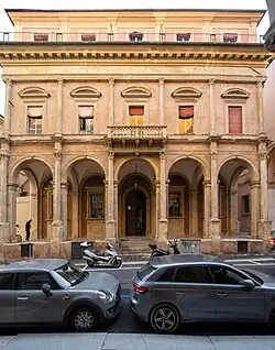 The palace was designed in 1529 by Andrea Marchesi da Formigine, perhaps with the help of Baldassare Peruzzi. The interiors were refurbished between 1782 and 1787 by Giovanni Storni, under commission by its then owner, Stefano Monari. The staircase was frescoed with the Rape of Deianira (1783–84) by Gaetano Gandolfi; other fresco decorations are by Serafino Barozzi.[2] The palace was donated by professor Augusto Gaudenzi to the university.