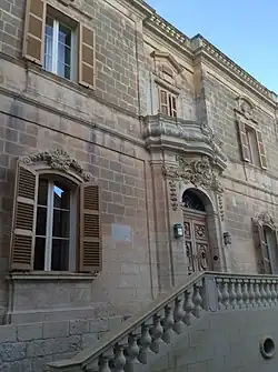 It is found next to the house of the Naxxar parish priest. Naxxar is a village on a hill,[4] while at the same time the palace is elevated from the street. It is built on two floor with a large underlying shelter.[2][3] It originally looked over the three villages.[5]