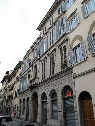 The building is mentioned by Gabriella Orefice as an example, in the Santa Croce district, of "...a successful operation of transformation of the ancient, dilapidated blocks of flats into a dignified building for bourgeois use, with innovative features compared to the recurring Florentine typologies, particularly if one considers the narrow and deep courtyard, in axis with the entrance portal, along which long balconies supported by corbels develop". The same building is also mentioned in Bargellini and Guarnieri's stradario for the courtyard mentioned earlier, called 'chiostrino' with paintings of religious subjects. In reality, the paintings are found in the entrance hall on the Via Fiesolana side and are related to a late 16th century taste, with scenes of the Genesis between grotesques. In the central panel is a representation of Faith, and in the side panels the Creation of Eve and the Withdrawal of the waters of the universal flood. Such subjects would suggest the presence in antiquity of a religious institute, perhaps dedicated to St. Anne, whose tabernacle existed not far away, giving its name to the nearby Canto di Sant'Anna.[2][3]