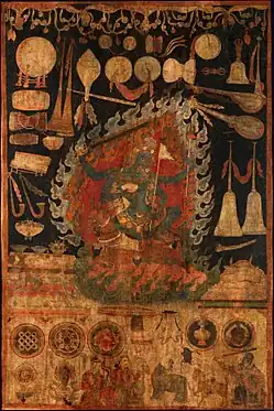 Palden Lhamo appears in the retinue of the Obstacle-Removing Mahakala, either as an independent figure[1] or associated to Ekajati,[6] and has been described as "the tutelary deity of Tibet and its government",[7] and as "celebrated all over Tibet and Mongolia, and the potent protector of the Dalai and Panchen Lamas and Lhasa."[8]