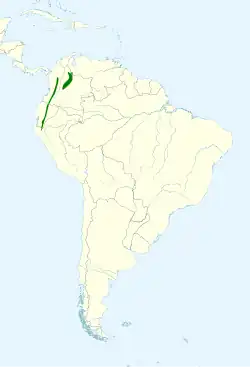 It is found in Colombia, Ecuador, Peru, and Venezuela. Its natural habitat is subtropical or tropical moist montane forest.