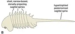 A vicissicaudatan arthropod that was aligned close to the trilobites. This creature had caudal flaps that are present on the terminal tergite, alongside an elongated spine. | ![]() |