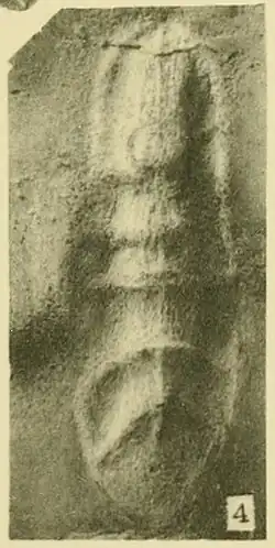 A species of large (up to 28 centimetres (11 in) long) soft-bodied arthropod known from two specimens from the Burgess Shale. Trackways that may have been produced by this organism or a close relative are known from the Kicking Horse Shale, stratigraphically below its body fossil occurrences. It is currently classified as a concilitergan arthropod within the Artiopoda. | ![]() |