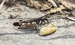 - Several empty ammonite shells from Holzmaden have been found with associated decapods inside.[6] This includes a possible member of the genus Paleastacus inside a chamber of a Harpoceras.[6] This decapod is related to the family Erymidae, which are considered to be possible bottom-dweller carnivores or carrion feeders.[6] The associated fossil has several spherical structures that had been interpreted as decapod coprolites, implying that the animal lived for a long period within the shell.[6] More recent studies had recovered new data about the inquilinism of decapods inside ammonites, this time, however, recovering three eryonoids together within a body chamber.[7] The eryonoids most likely used the ammonoid as some kind of shelter, possibly due to the shell being an ideal location to molt, protection against predators, a source of food or that the shell was used as a long-term shelter.[7] One key aspect found was that the muddy bottom was not suitable for burrowing, implying that the decapods inhabited a different shelter due to being unable to make their own.[7] Other biota are found related to the decayed ammonite shells, such as serpulid annelids and bivalves, creating what was denominated as "benthic islands".[6]