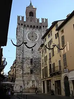 Construction began in 1254, in the city quarter of San Giovanni. It was associated with a medieval gate, the Porta di San Giovanni, in the early walls of the city. The tower once held the vaults of a bank or Monte di Pieta. Over the centuries, decorations were added, such as a clock in 1461 and merlons and a small tower at the top between 1476 and 1481. In 1597, the west side of the tower had the addition of a fountain, built in Mannerist style. The fountain was based on a design and iconography by Pier Maria Bagnadore and built by the architect Antonio Carra, and the statuary was completed by the sculptor Valentino Bonesini.[1] The fountain has four allegoric statues, with the lower register representing either the two rivers in Brescia, the Mella and the Garza, or the two lakes in the province, Garda and Iseo.[2]