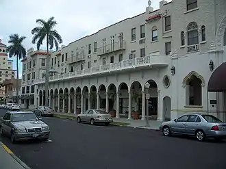 Unlike some other hotels in Palm Beach, the Palm Beach Hotel did not often attract particularly wealthy clientele. However, the hotel hosted guests such as W. C. Fields, Arthur Hammerstein, Kyra Markham, William Starr Myers, and Will Rogers.[2]: 16 During the 1928 Okeechobee hurricane, the hotel suffered water damage and some windows broke.[7] As the Great Depression began, construction of large hotels in the area ceased, while prominent hotels such as the Royal Poinciana Hotel closed for business. The Palm Beach Hotel, however, continued to host social functions, including assisting individuals in finding employment.[2]: 16 Five shops along the building's south side were closed in 1930 and replaced with a courtyard patio and loggia. Around 1946, minor renovations were made.[2]: 11 The hotel struggled to remain in business during the following decades and was abandoned in 1969, though there were attempts to utilize the building as a retirement hotel.[2]: 17