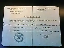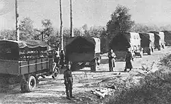 Victims were transported to the place of execution by trucks. Usually they were brought from Pawiak prison, rarely from Mokotów Prison. SS soldiers tried to convince their victims that they are going to transfer them to another prison or to a concentration camp. For this reason, death transports were usually formed at dusk and prisoners were allowed to take their belongings with them. Sometimes before departure convicts received an additional food ration and they were given back their documents from the prison's depository.[13] Initially, these methods were so effective that the prisoners were not aware of the fate awaiting them.[14] Later, when the truth about what was happening in Palmiry spread through Warsaw, some victims tried to throw short letters or small belongings from the trucks, in hopes that in this way they would be able to inform their families about their fate.[13] During postwar exhumation some bodies were found with a card reading "Executed in Palmiry", written by the victims shortly before their death.[15]