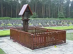 In 1948 the forest glade near Palmiry was transformed into a war cemetery and a mausoleum.[52] Victims of Nazi terror whose bodies were found in some other places of execution within the so-called "Warsaw Death Ring"[e] were also buried in the Palmiry cemetery. Altogether, approximately 2204 people are buried there.[53] In 1973, the Palmiry National Memorial Museum, a branch of the Museum of Warsaw, was created in Palmiry.[52]