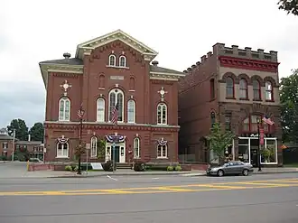 Notable buildings include the Village Hall (1866-1868), Griffith Block (c. 1893), First National Bank (1925), bandstand on the village green (c. 1906), First Methodist Church (1866-1867), Western Presbyterian Church (c. 1832), First Baptist Church (1871), St. Anne's Roman Catholic Church (1859-1870s), Alexander McKachnie House (c. 1830), Garlock Office Building, Sherburne Ford building (c. 1910), Palmyra Elementary School (1924), the Carlton Rogers House (1850s), and the Floral Hall (1856).[2]