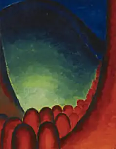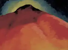 Inspired by the principles of Arthur Wesley Dow and the Texas landscape, O'Keeffe made paintings using vibrant red, blue and yellow colors.[5] About 1916, she used brilliant red and yellow colors in Special #21: Palo Duro Canyon, which belongs to the New Mexico Museum of Art. It was stolen in December 2003 and has not been recovered.[5] Red Landscape is an abstract expressionist oil painting made in 1916–1917 of the bright red canyon walls,[1] which are the Permian Red Beds from the Jurassic era. A yellow sun shines below a dark sky.[6] Canyon with Crows, a watercolor made in 1917, "depicts a deep purple arroyo that lightens higher to yellows and orange while impressionistic black crows hover in a pale blue sky."[6]