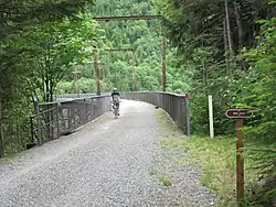 The park is contiguous with a rail trail that crosses Snoqualmie Pass. The trail is located within the former right-of-way of The Milwaukee Road, officially the Chicago, Milwaukee, St. Paul and Pacific Railroad. Most of the right-of-way between Cedar Falls and the Idaho border was acquired by the state, through a quitclaim deed, as a result of the railroad's 1977 bankruptcy. As part of the reorganization of the company, the railroad embargoed its lines west of Miles City, Montana, in 1980 and ceased service in Washington. The state acquired the land in the early 1980s and eventually converted the right-of-way west of the Columbia River into a 110-mile (177 km) hiking, mountain biking, and horseback riding trail. The trail continues beyond Iron Horse State Park to the Idaho border.[10][11] Iron Horse State Park contains the most developed portion of the trail.